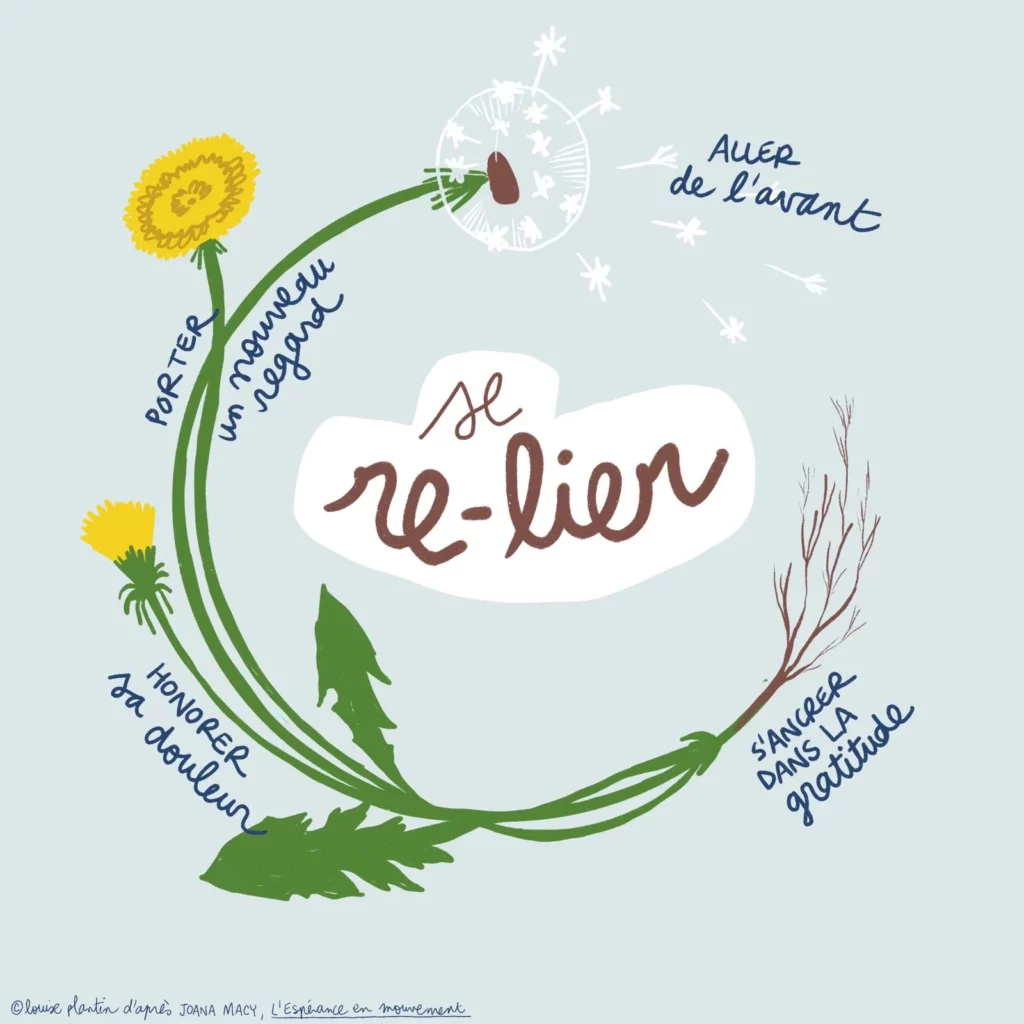 Le Travail qui Relie est un processus de soin collectif créé par Joanna Macy, écoféministe américaine, dans les années 1970. Il s’agit d’un voyage en spirale pour accueillir nos souffrances liées à la destruction du monde, pour retrouver du sens et de la puissance dans nos actions, dans l’intention d’agir pour soutenir le Vivant.